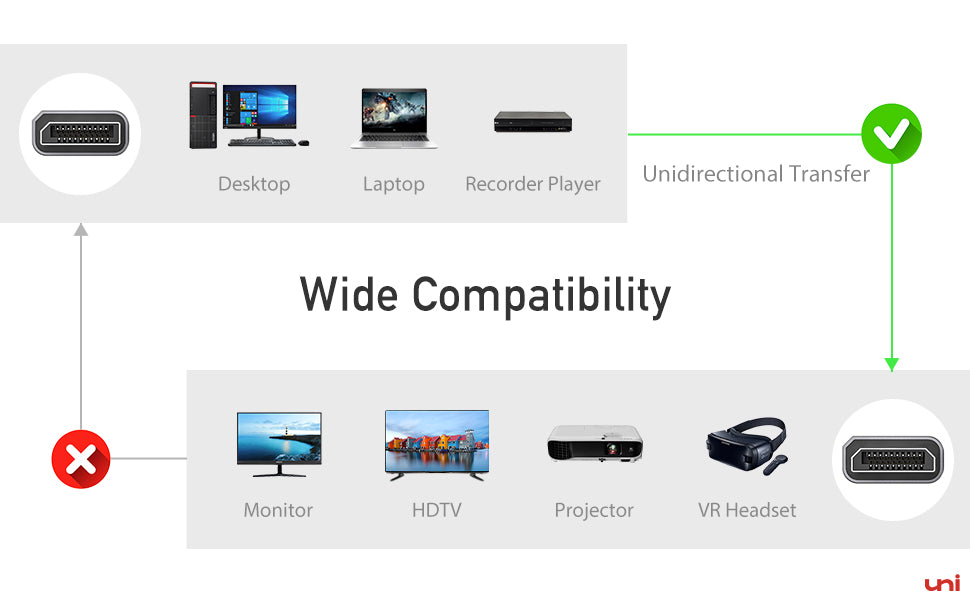 It is an UNI-DIRECTIONAL cable, works only from DisplayPort (DP, DP++, DisplayPort++)of desktops / laptops to an HDTV / monitor / projector with HDMI output uni-directionally.